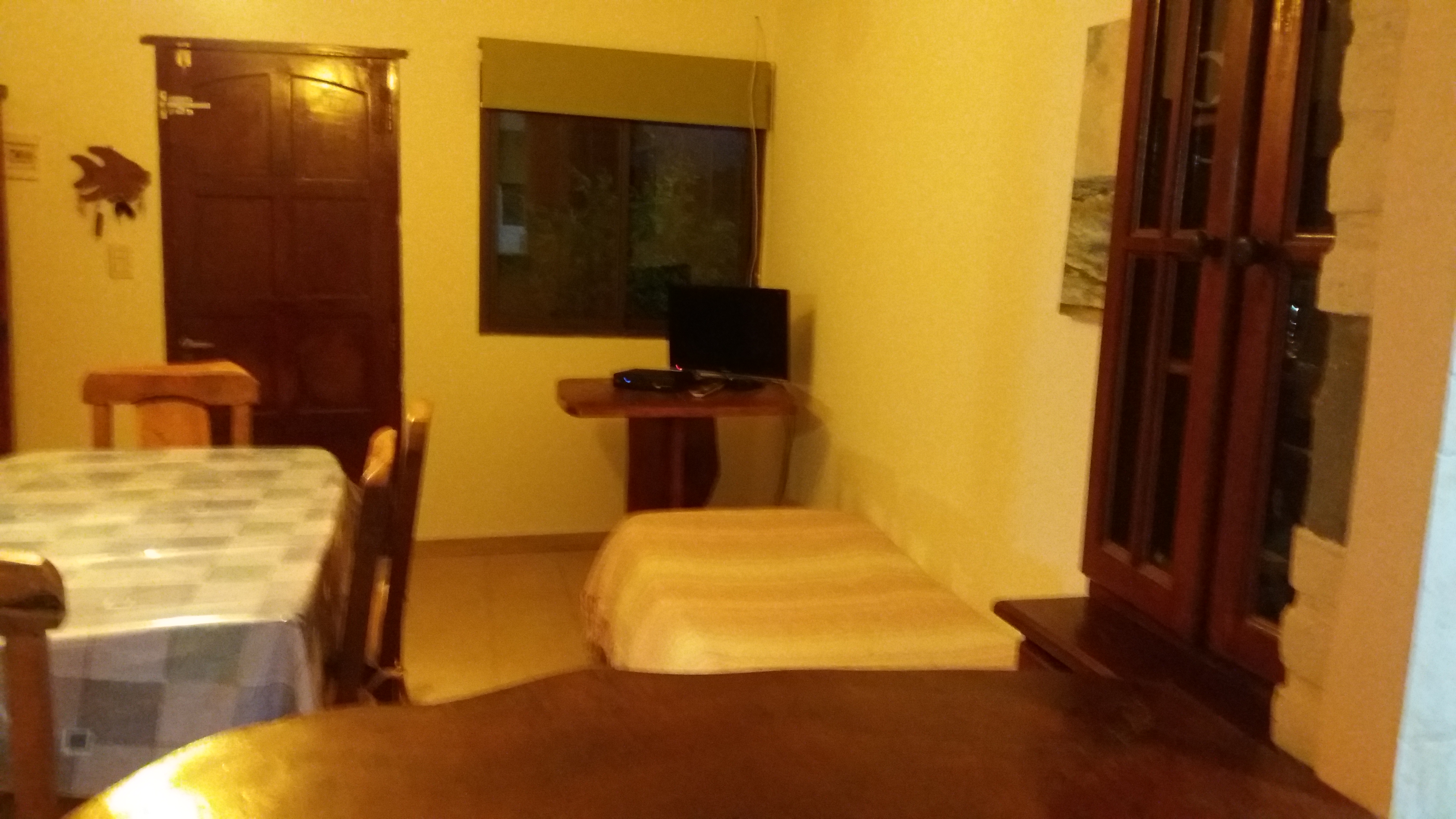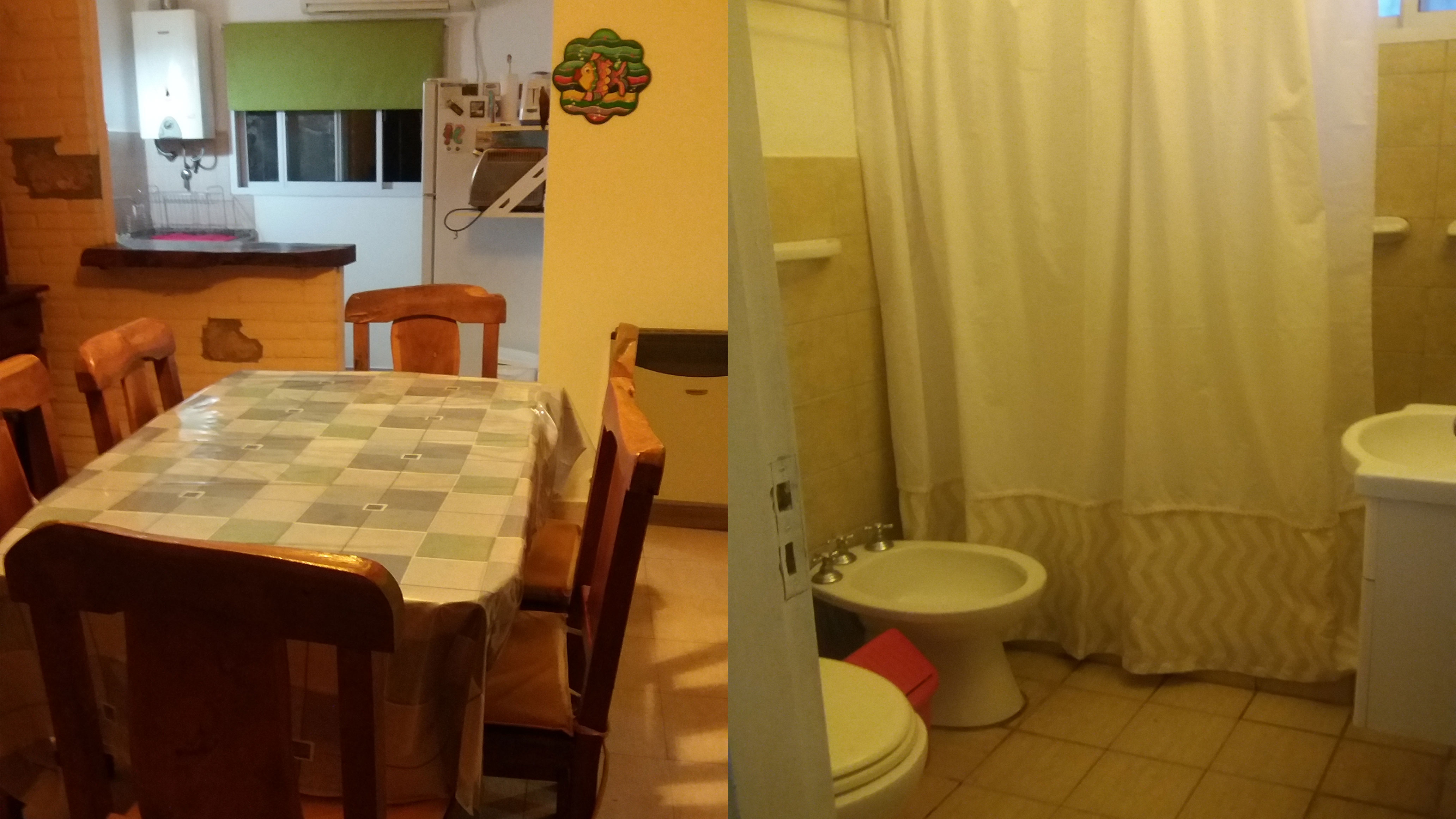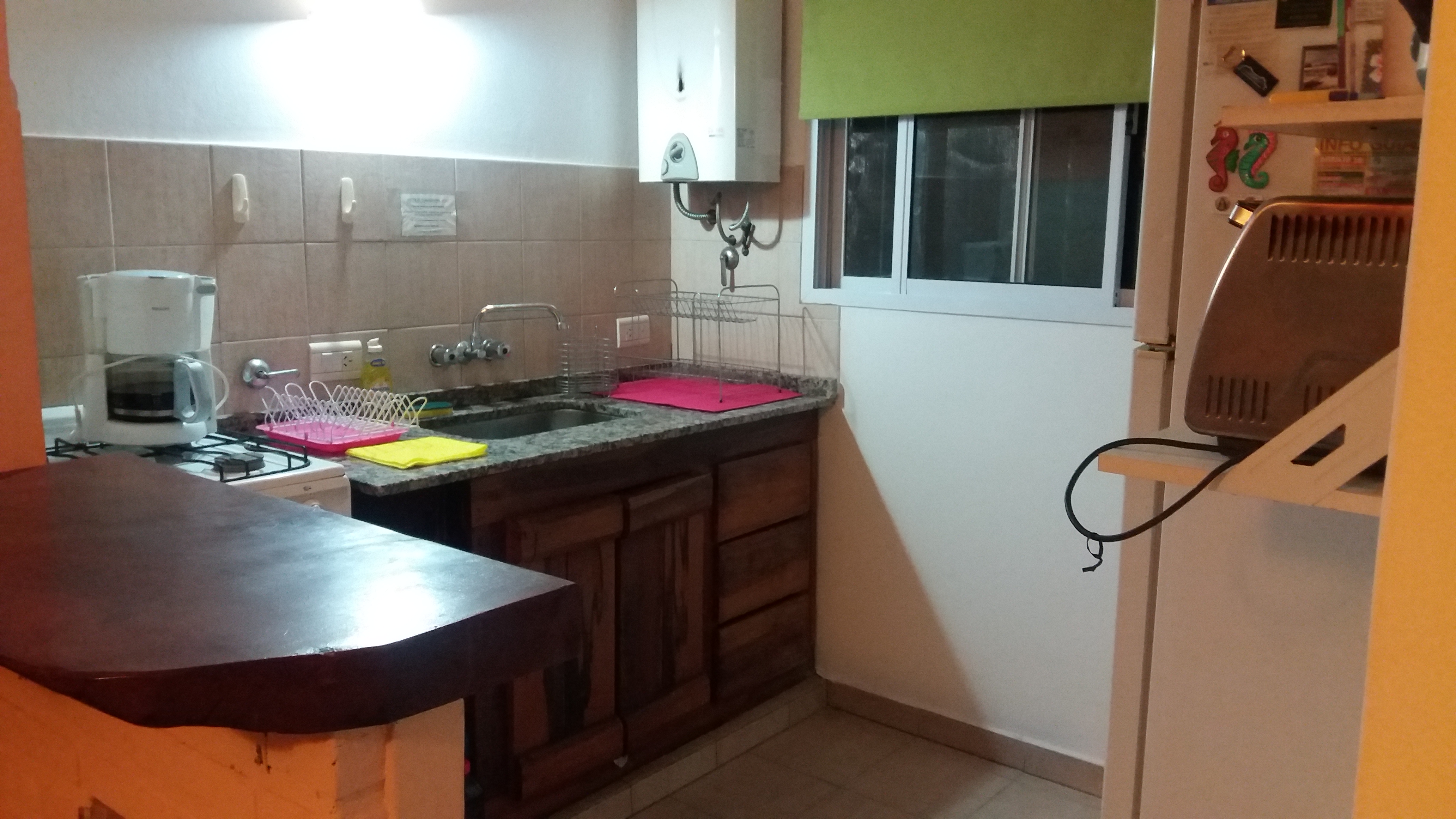 Cocina – comedor ( horno eléctrico y cocina con horno ), heladera, living con sofá cama ( 1 ) y galería con cochera.